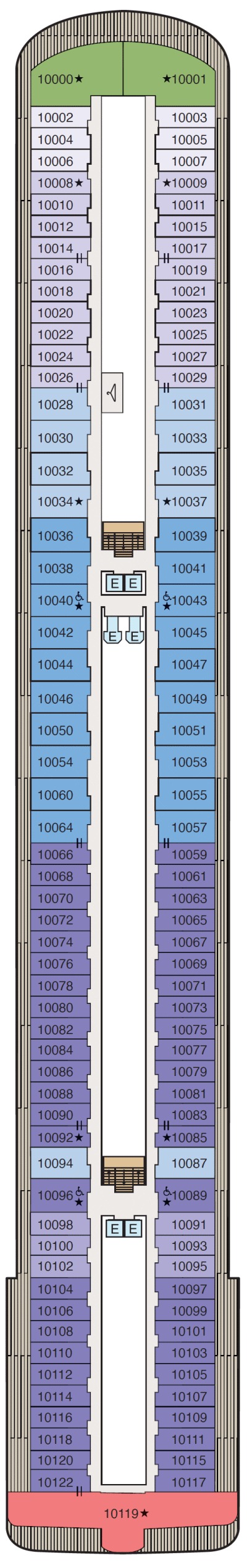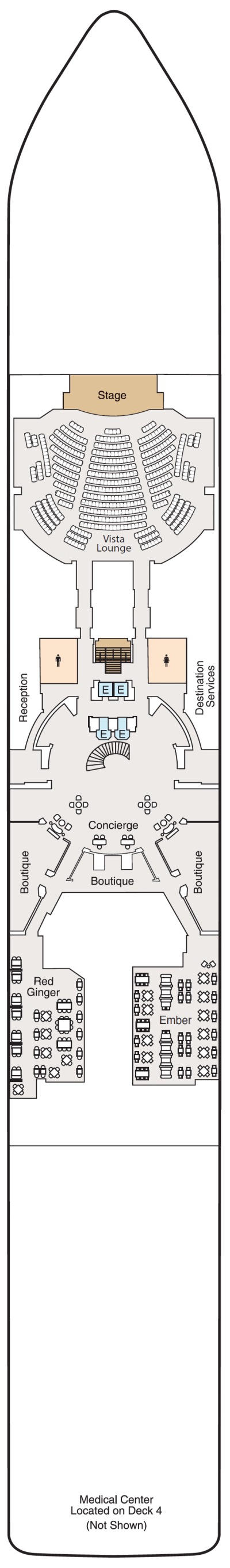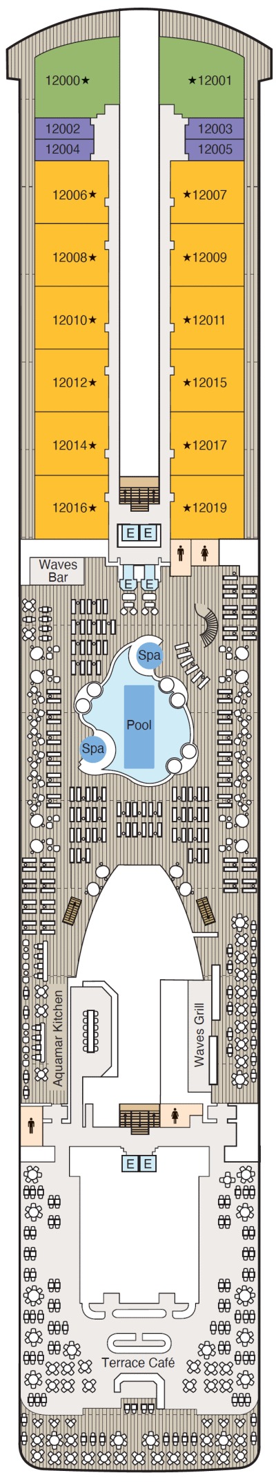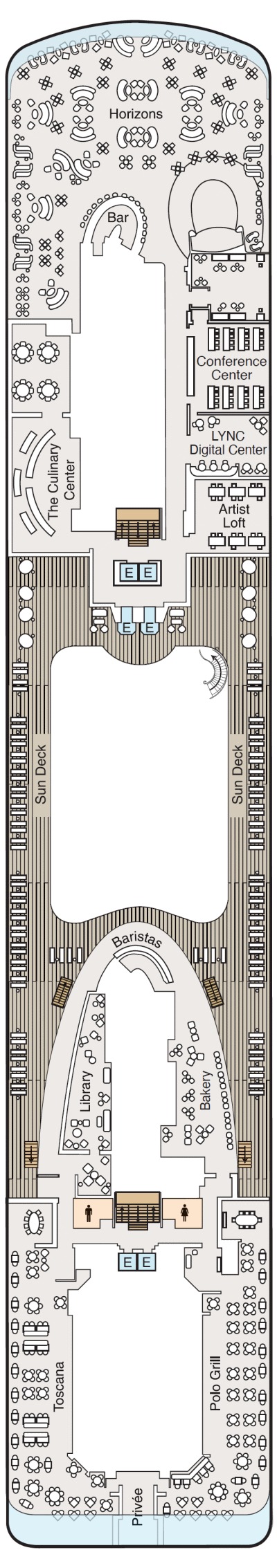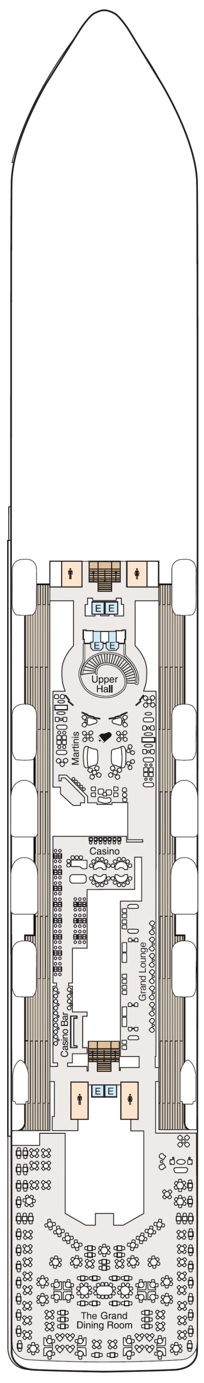 Découvrez les différents ponts du navire, chacun offrant des espaces et des ambiances uniques. Que ce soit pour profiter de la vue, vous détendre, vous divertir ou accéder aux installations principales, les ponts sont conçus pour faciliter votre expérience et vous permettre de vivre pleinement votre croisière.