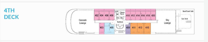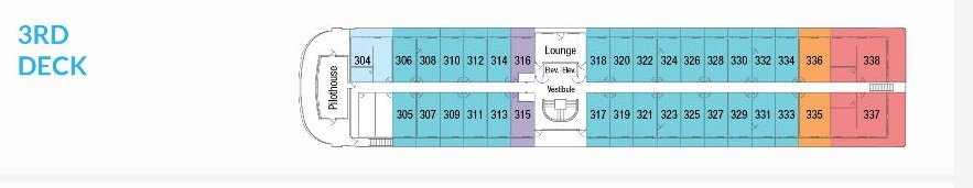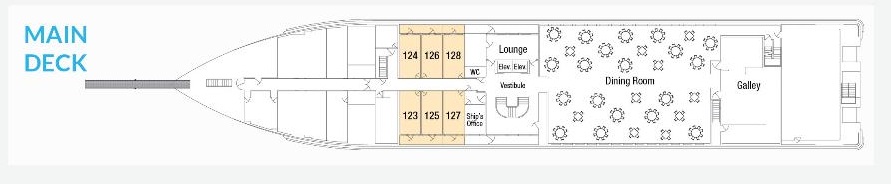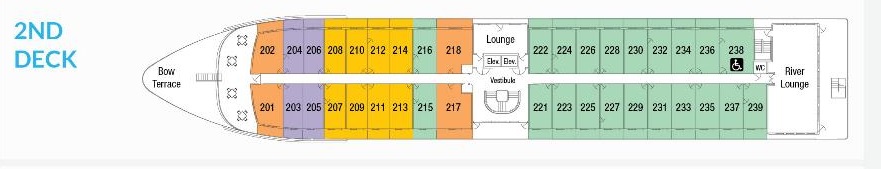 Découvrez les différents ponts du navire, chacun offrant des espaces et des ambiances uniques. Que ce soit pour profiter de la vue, vous détendre, vous divertir ou accéder aux installations principales, les ponts sont conçus pour faciliter votre expérience et vous permettre de vivre pleinement votre croisière.