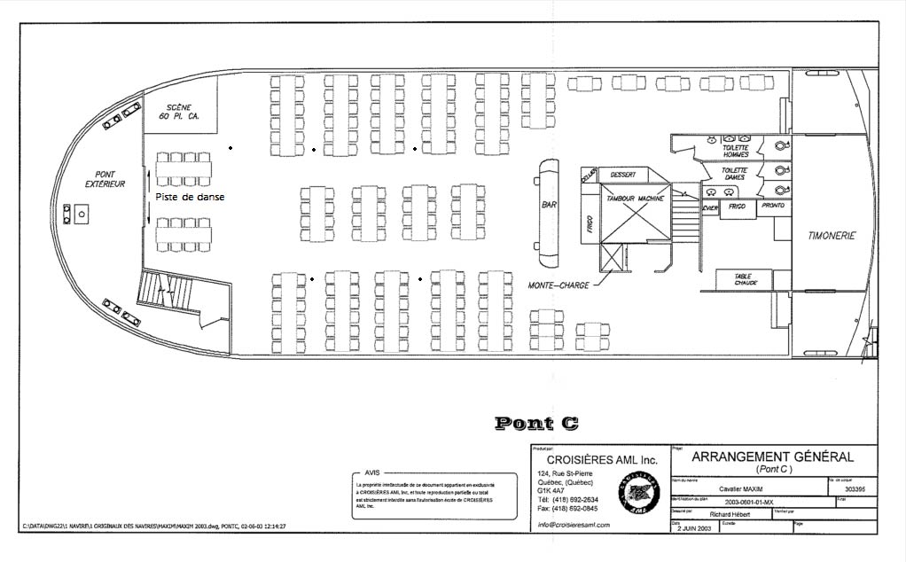 Le choix par excellence dans le Vieux-Port de Montréal ! Le AML Cavalier Maxim vous impresionnera par la beauté de son intérieur et par son ambiance raffinée. Pouvant accueillir jusqu'à 800 passagers, l'unique bateau restaurant de Montréal se distingue par ses salles panoramiques entièrement vitrées, ses terrasses extérieures, le professionnalisme de son équipage ainsi que la qualité des mets préparés à bord. Un incontournable pour la saison estivale !