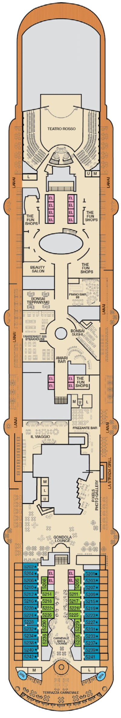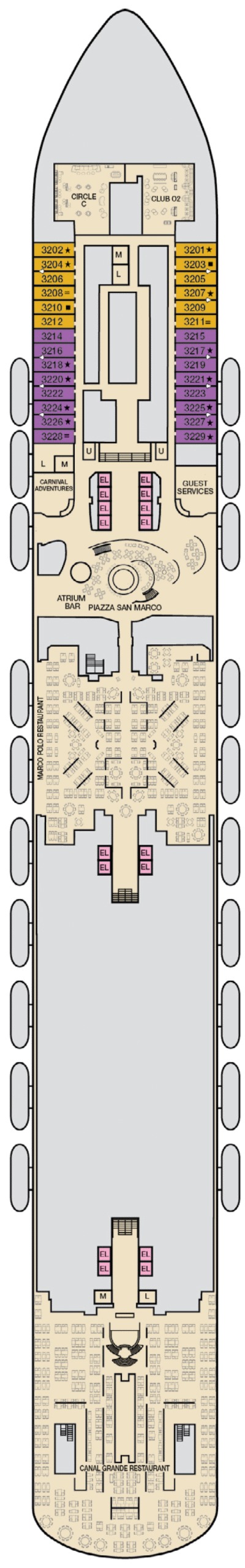 Le Carnival Venezia s'inspire de l'histoire et de la tradition vénitiennes. Tout commence par la saveur et l'élégance à bord dans des endroits comme la place Saint-Marc, le Teatro Rosso et ses colonnes de marbre et le restaurant Marco Polo à trois plats avec des sculptures italiennes et des plats authentiques servis tous les soirs. Les cabines Terrazza Carnevale offrent une toute nouvelle façon de découvrir le style et le confort et offrent des équipements exclusifs comme l'accès à une terrasse privée et à un bar sur le toit. Le navire propose également de nombreux classiques Carnival. Les plats de croisière, préparés avec goût, proviennent d'endroits comme Bonsai Sushi™, Fahrenheit 555 Steakhouse™, Lido Marketplace et Bonsai Teppanyaki™. Détendez-vous au Cloud 9 Spa™ ou au Serenity Adult-Only Retreat™ pendant que les enfants se déchaînent dans des espaces conçus spécialement pour eux. Goûtez à l'aventure en plein air à WaterWorks™ ou SportSquare™, avec un parcours de cordes, une piste de jogging, un mini-golf et un centre de remise en forme en plein air.
