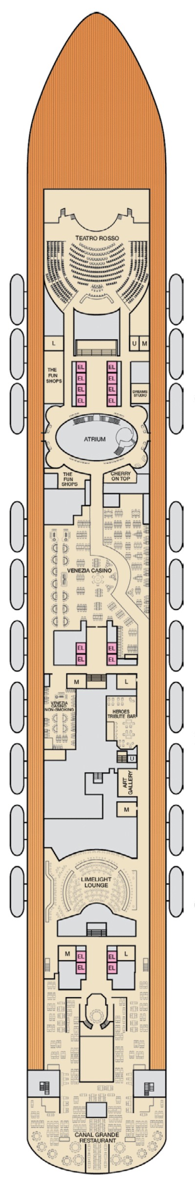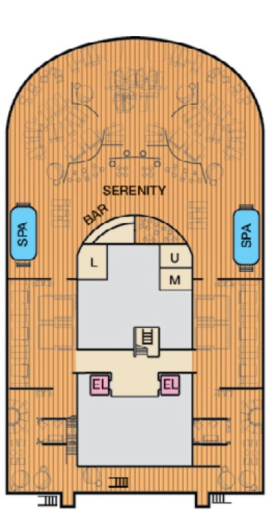 Découvrez les différents ponts du navire, chacun offrant des espaces et des ambiances uniques. Que ce soit pour profiter de la vue, vous détendre, vous divertir ou accéder aux installations principales, les ponts sont conçus pour faciliter votre expérience et vous permettre de vivre pleinement votre croisière.