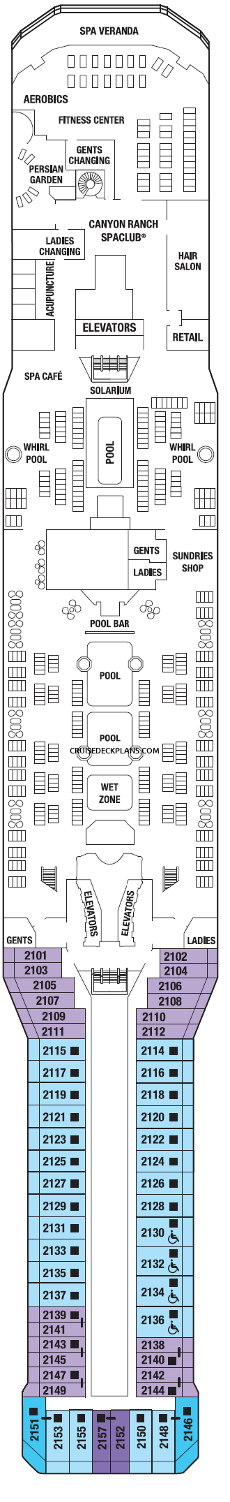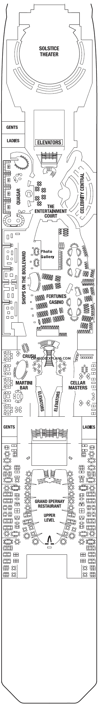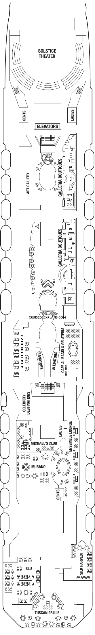 Le Celebrity Solstice a été le premier navire de sa catégorie et continue d'être l'un des navires les plus innovants de la flotte. Les équipements des cabines sont l'image même du luxe moderne avec des peignoirs gratuits, une télévision interactive à écran plat, un service de maquillage et de préparation à la nuit quotidien, une literie Celebrity eXhale, un coffre-fort privé, un minibar privé, des produits de bain personnalisés et un service d'étage 24h/24. Huit cabines sur dix offrent également une vue depuis le balcon pour le plus grand plaisir des passagers. Les divertissements ne manquent pas à bord du navire, du spectacle innovant Hot Glass Show aux spectacles dans le salon. Le large éventail de restaurants et de cafés élèvera votre palette à un tout autre niveau. Les cabines AquaClass raviront les amateurs de spa : ces cabines offrent un accès illimité à un restaurant privé et au Spa pour une expérience de bien-être ultime. Quelles que soient vos envies, il y a quelque chose pour vous sur le Solstice.