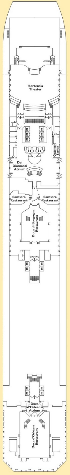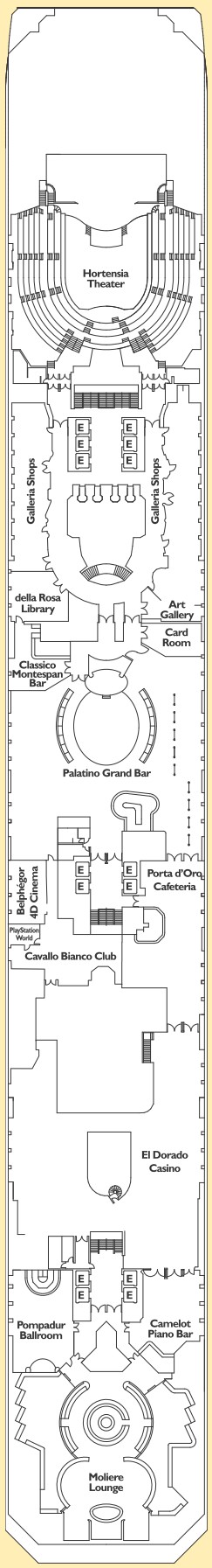 Le Costa Favolosa impressionne par ses matériaux précieux et son mobilier inspiré de la magie et des contes de fées. L'atrium est ébloui par des décorations étincelantes en forme de diamant et les espaces de style gothique offrent un changement accueillant par rapport à la vie sur terre. Des milliers d'œuvres d'art sont exposées sur le navire, toutes inspirées par la beauté. Les amateurs de spa opteront pour l'une des suites bien-être avec accès direct au vaste spa. S'étendant sur deux niveaux, le Solemio Spa comprend une piscine de thalassothérapie, des salles de soins, un sauna, des jacuzzis, un bain turc et même une salle de sport entièrement équipée. Les amateurs de chocolat et de café apprécieront le bar spécialement conçu pour eux. Plusieurs restaurants, un bar Aperol Spritz, un bar à vins, une discothèque, un casino, un théâtre sur trois niveaux et un club pour enfants ne sont que quelques-unes des options de cuisine et de divertissement à bord.