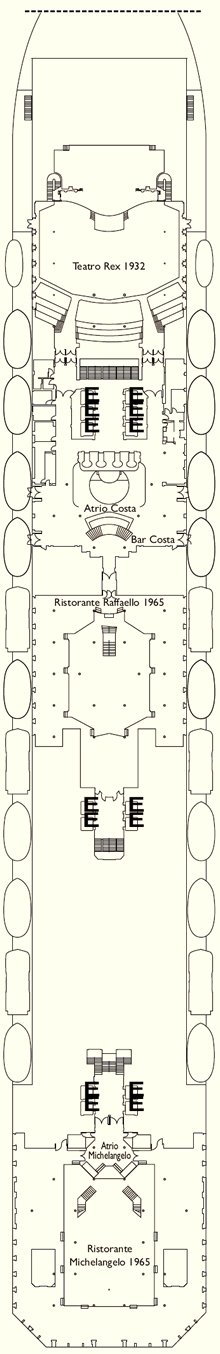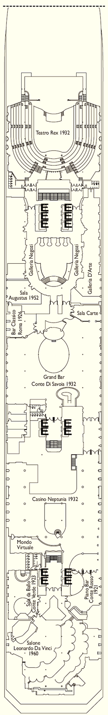 Construit dans les chantiers navals historiques de Sestri Ponente à Gênes, le Costa Fortuna rappelle le passé avec son élégant hall d'entrée, agrémenté de plusieurs maquettes des plus beaux navires de la flotte Costa. De grandes maquettes classiques d'œuvres de Michel-Ange et de Rex bordent le navire, ajoutant une touche de luxe à l'ambiance du Fortuna. Les sept restaurants proposent une cuisine exquise. Le grand centre de bien-être propose une salle de sport, des salles de soins spa, un sauna et des bains turcs. Les jacuzzis et les piscines vous permettront d'être aussi actif ou détendu que vous le souhaitez pendant votre croisière. Les options de divertissement sont presque infinies entre le théâtre Rex sur trois niveaux, la discothèque Vulcania, le casino Neptunia, la salle de cartes, la bibliothèque, le centre commercial et même un club réservé aux enfants.