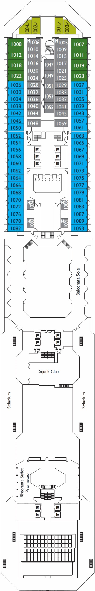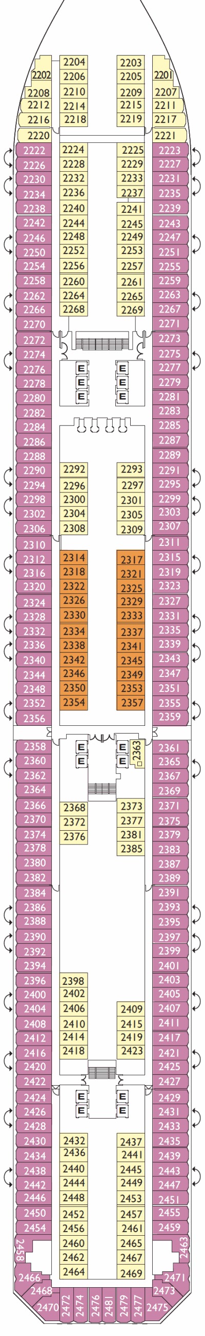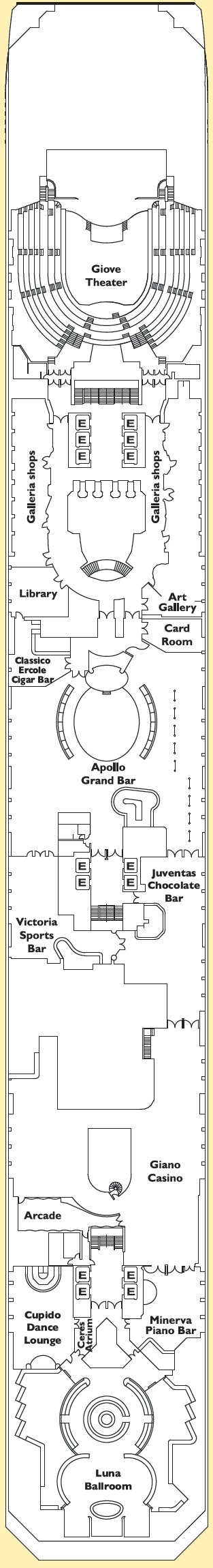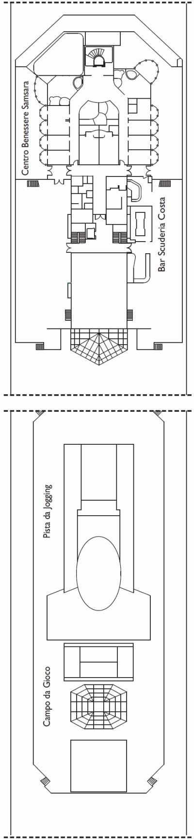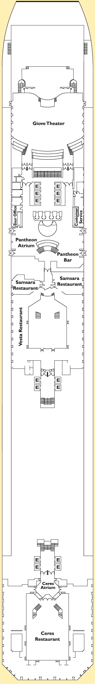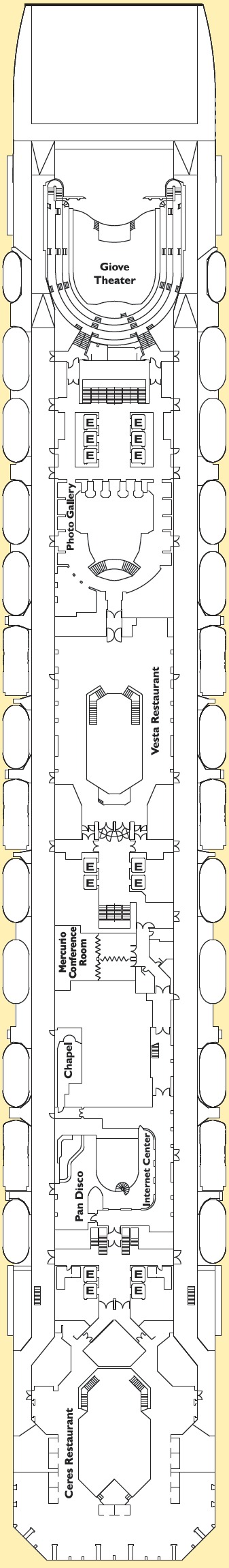 Découvrez les différents ponts du navire, chacun offrant des espaces et des ambiances uniques. Que ce soit pour profiter de la vue, vous détendre, vous divertir ou accéder aux installations principales, les ponts sont conçus pour faciliter votre expérience et vous permettre de vivre pleinement votre croisière.