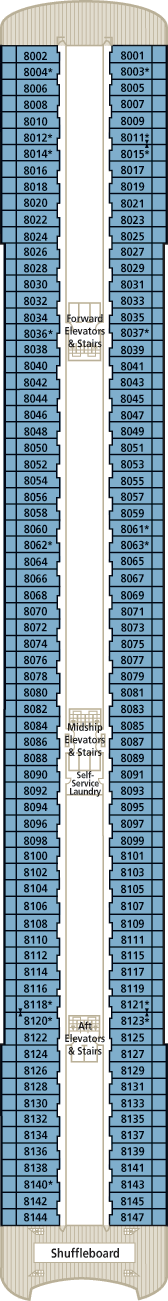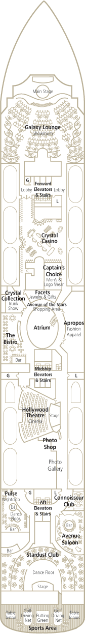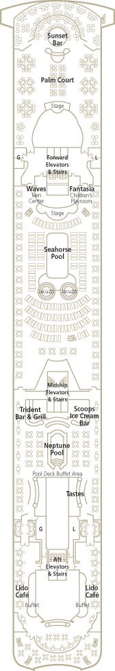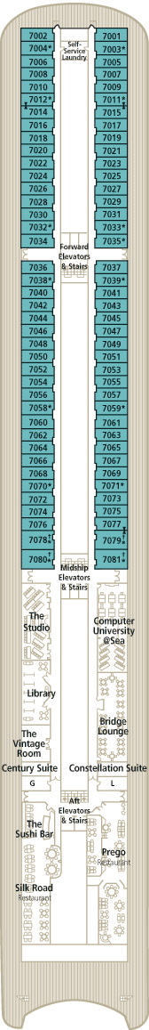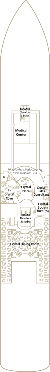 Découvrez les différents ponts du navire, chacun offrant des espaces et des ambiances uniques. Que ce soit pour profiter de la vue, vous détendre, vous divertir ou accéder aux installations principales, les ponts sont conçus pour faciliter votre expérience et vous permettre de vivre pleinement votre croisière.