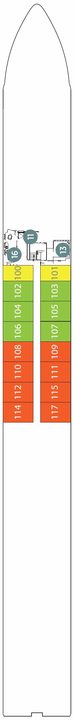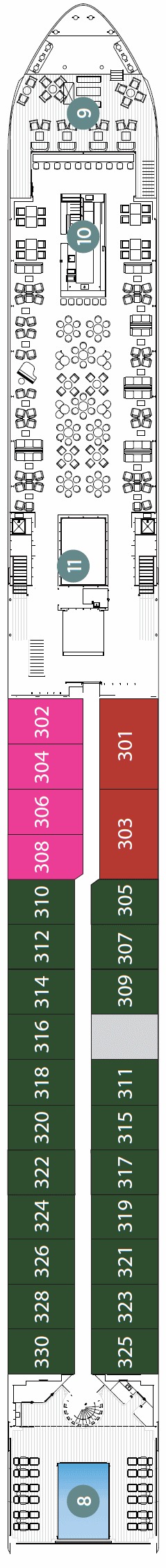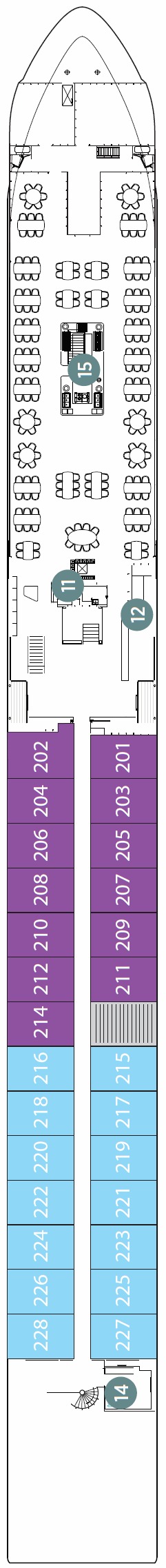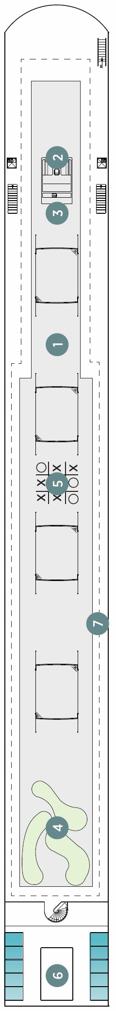 Découvrez les différents ponts du navire, chacun offrant des espaces et des ambiances uniques. Que ce soit pour profiter de la vue, vous détendre, vous divertir ou accéder aux installations principales, les ponts sont conçus pour faciliter votre expérience et vous permettre de vivre pleinement votre croisière.