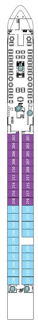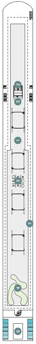 Découvrez les différents ponts du navire, chacun offrant des espaces et des ambiances uniques. Que ce soit pour profiter de la vue, vous détendre, vous divertir ou accéder aux installations principales, les ponts sont conçus pour faciliter votre expérience et vous permettre de vivre pleinement votre croisière.