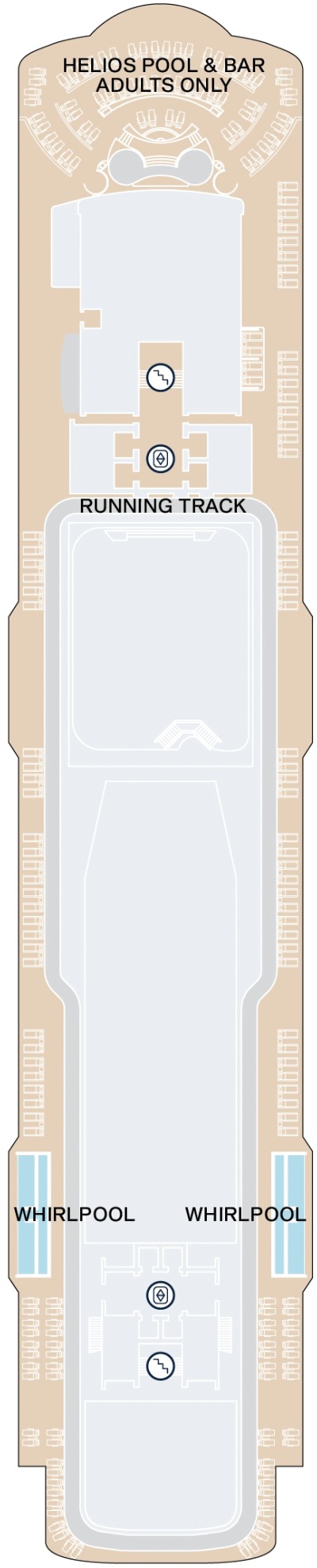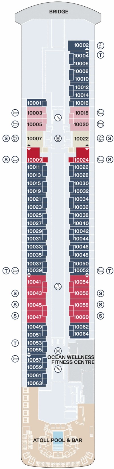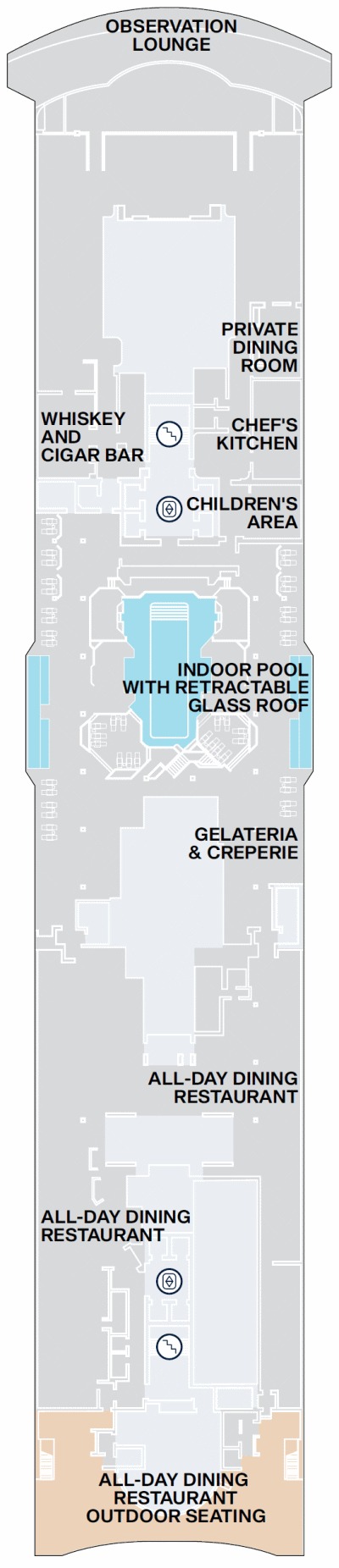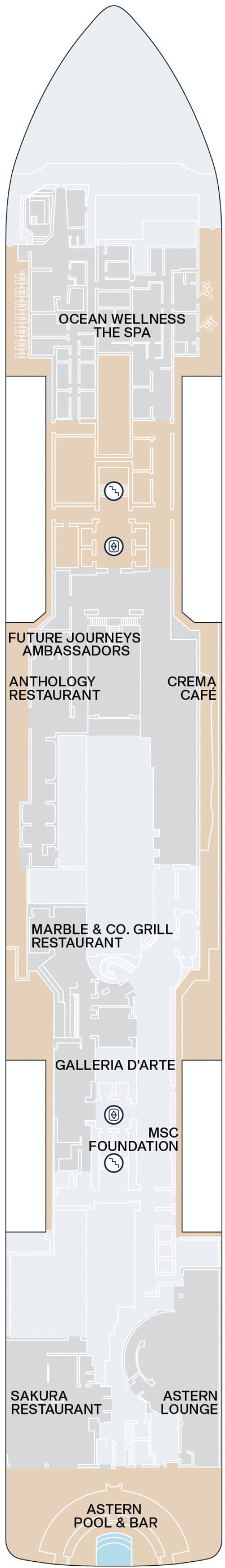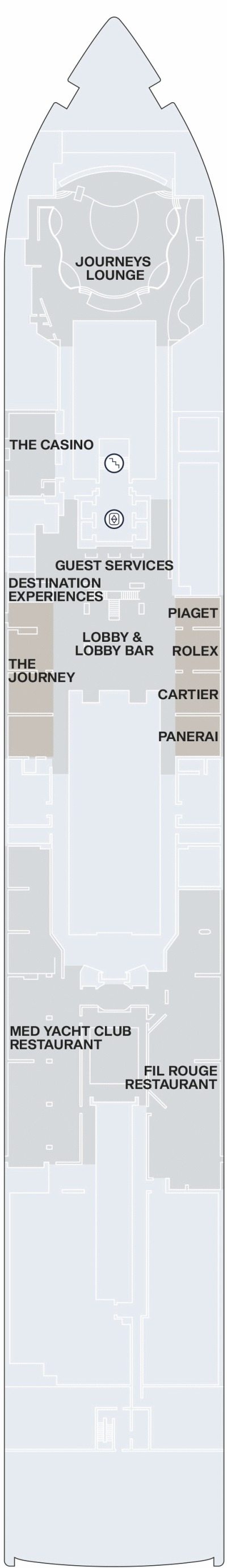 Découvrez les différents ponts du navire, chacun offrant des espaces et des ambiances uniques. Que ce soit pour profiter de la vue, vous détendre, vous divertir ou accéder aux installations principales, les ponts sont conçus pour faciliter votre expérience et vous permettre de vivre pleinement votre croisière.