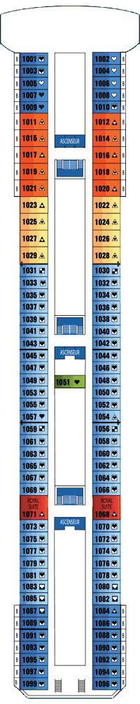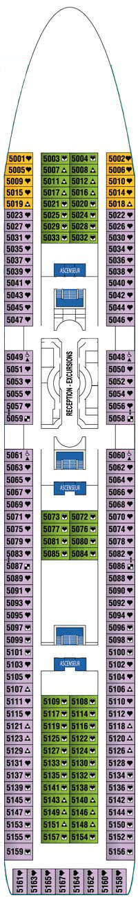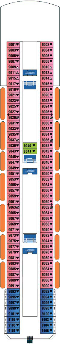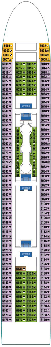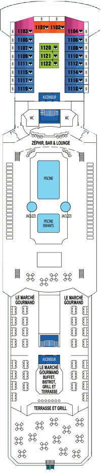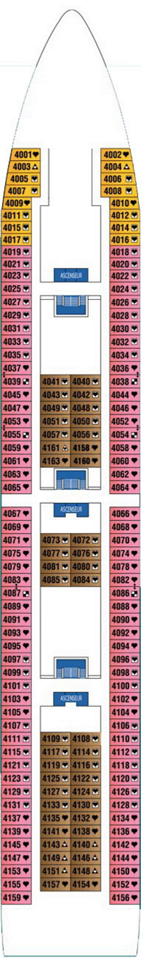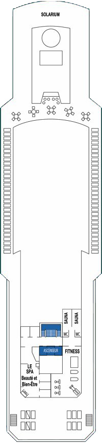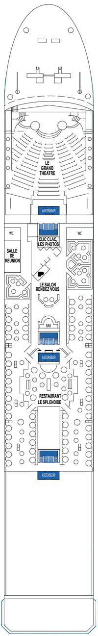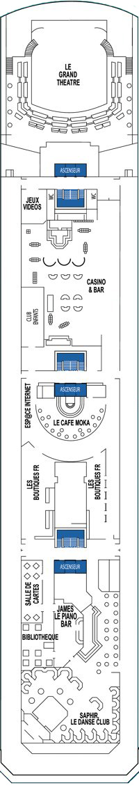 Découvrez les différents ponts du navire, chacun offrant des espaces et des ambiances uniques. Que ce soit pour profiter de la vue, vous détendre, vous divertir ou accéder aux installations principales, les ponts sont conçus pour faciliter votre expérience et vous permettre de vivre pleinement votre croisière.