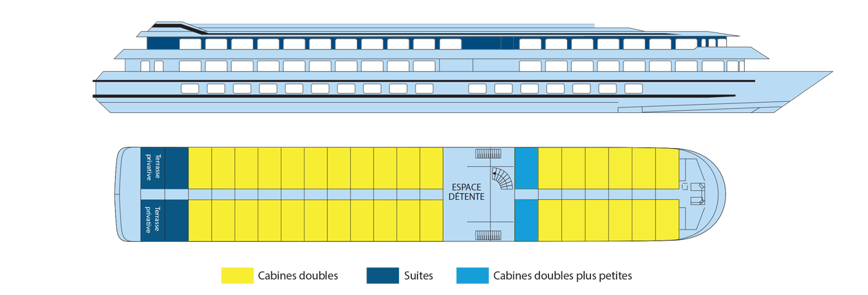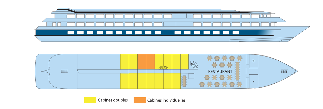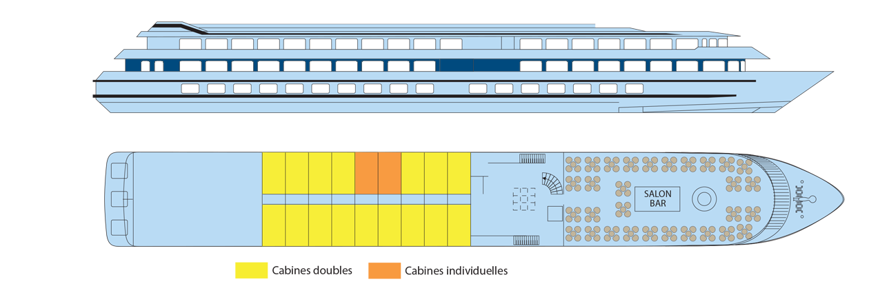 Entièrement rénové en 2015, le MS Fernão de Magalhães est un bateau 4 ancres à dimension humaine, mesurant 75 mètres de long et 11,40 mètres de large. Il peut accueillir 138 passagers, dans 71 cabines disposées sur trois ponts. Chacune des cabines, d’une superficie variant de 11 à 14 m2, dispose de toutes les commodités et offre les meilleures conditions de séjour. La majorité des cabines sont situées sur le pont supérieur et disposent de larges baies vitrées avec balcon à la française. Celles des ponts intermédiaire et principal disposent de grandes fenêtres. La décoration est soignée et son atmosphère, à la fois élégante et conviviale, est en parfait accord avec son environnement. Les tons pastel rappellent la douceur qui baigne la région et les coteaux verdoyants. Situé au niveau du pont principal, le restaurant, où sont servis tous les repas pendant le voyage, propose une cuisine délicate dans un cadre raffiné, où de larges baies vitrées permettent de profiter pleinement du panorama. Au niveau du pont intermédiaire se trouve le salon-bar avec piste de danse. Une piscine agrémente le pont-soleil, où l’on trouve également un grand espace ombragé et de confortables transats pour se relaxer.