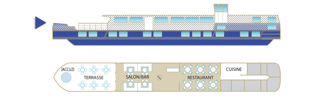 Le MS Jeanine est une superbe péniche 5 ancres à dimension humaine, mesurant 38,50 mètres de long et 5,07 mètres de large. Elle peut accueillir 22 passagers, dans 11 cabines disposées sur deux ponts. Chacune d’entre elles, d’une superficie variant de 8 m2 (plus une cabine PMR de 11 m2), dispose de toutes les commodités et offre les meilleures conditions de séjour. À bord, tout est soigné dans les moindres détails et les 5 membres d’équipage garantissent un service personnalisé. La décoration est soignée et son atmosphère, à la fois élégante et intimiste, est en parfait accord avec son environnement. Au niveau du pont supérieur se trouvent le restaurant, qui propose une cuisine délicate dans un cadre raffiné, le salon-bar et un espace détente doté d’un jacuzzi. Sur le pont-soleil, lieu idéal pour se relaxer et admirer les paysages, les passagers peuvent disposer de confortables transats. Un voyage à bord du MS Jeanine est la promesse d’une escapade inoubliable au fil de l’eau.