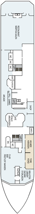 À l'extérieur sur le pont, vous pourrez vous imprégner de la vue depuis les bains bouillonnants. Un bar confortable se trouve à l'avant du navire où vous pourrez profiter d'une bonne boisson traditionnelle. Ce navire dispose d'un vaste hall en forme de compas où se trouvent la réception, l’equipe d’expédition, une salle de conférence et un magasin.