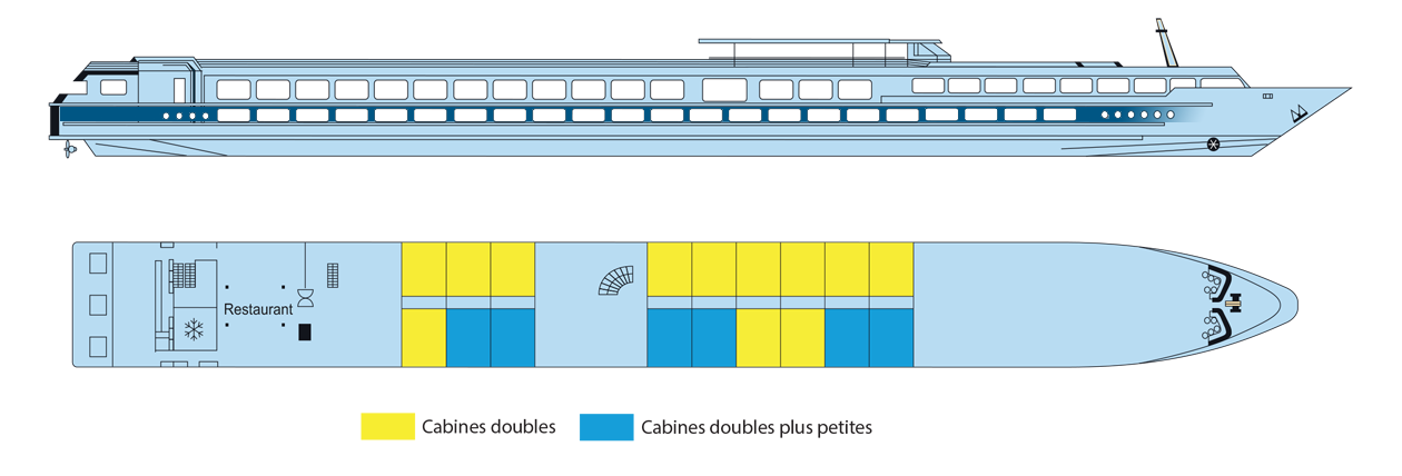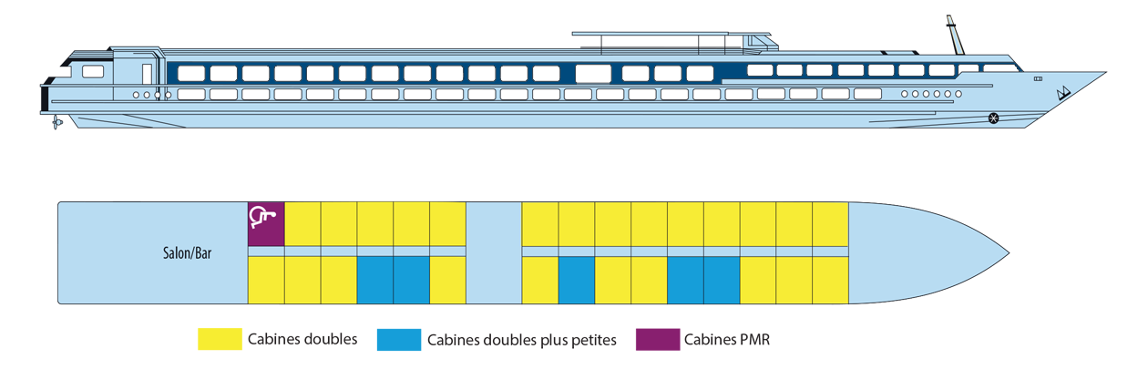 Le MS Loire Princesse navigue sur la Loire entre Saint-Nazaire et Angers et offre à ses passagers une atmosphère tranquille dans laquelle se détendre et profiter des panoramas pittoresques de la région. Toutes les cabines sont situées au-dessus du niveau de l'eau et sont équipées de télévision par satellite, radio, sèche-cheveux et coffre-fort. Les cabines situées sur le pont supérieur disposent de grandes baies vitrées. Que vous admiriez la vue spectaculaire depuis votre confortable cabine, que vous dîniez au restaurant, que vous dansiez toute la nuit ou que vous vous installiez simplement sur le spacieux pont soleil, il y a toujours quelque chose à voir ou à faire !