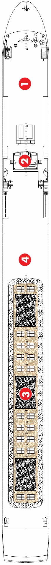 Découvrez les différents ponts du navire, chacun offrant des espaces et des ambiances uniques. Que ce soit pour profiter de la vue, vous détendre, vous divertir ou accéder aux installations principales, les ponts sont conçus pour faciliter votre expérience et vous permettre de vivre pleinement votre croisière.