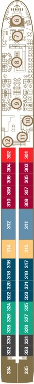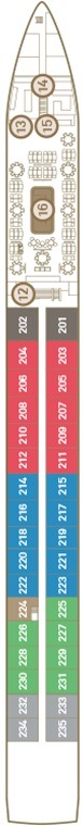 Découvrez les différents ponts du navire, chacun offrant des espaces et des ambiances uniques. Que ce soit pour profiter de la vue, vous détendre, vous divertir ou accéder aux installations principales, les ponts sont conçus pour faciliter votre expérience et vous permettre de vivre pleinement votre croisière.