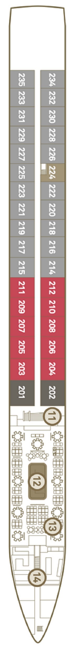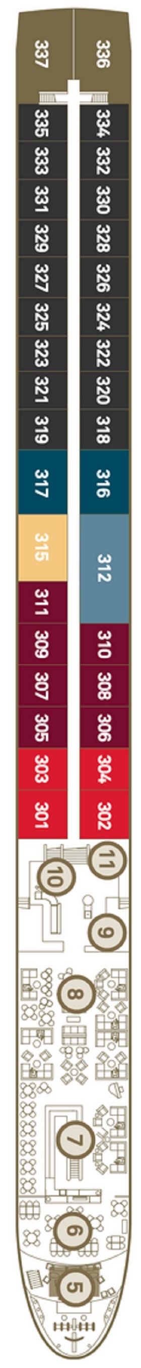 Découvrez les différents ponts du navire, chacun offrant des espaces et des ambiances uniques. Que ce soit pour profiter de la vue, vous détendre, vous divertir ou accéder aux installations principales, les ponts sont conçus pour faciliter votre expérience et vous permettre de vivre pleinement votre croisière.