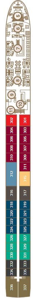 Découvrez les différents ponts du navire, chacun offrant des espaces et des ambiances uniques. Que ce soit pour profiter de la vue, vous détendre, vous divertir ou accéder aux installations principales, les ponts sont conçus pour faciliter votre expérience et vous permettre de vivre pleinement votre croisière.