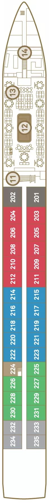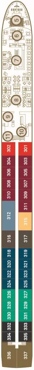 Découvrez les différents ponts du navire, chacun offrant des espaces et des ambiances uniques. Que ce soit pour profiter de la vue, vous détendre, vous divertir ou accéder aux installations principales, les ponts sont conçus pour faciliter votre expérience et vous permettre de vivre pleinement votre croisière.