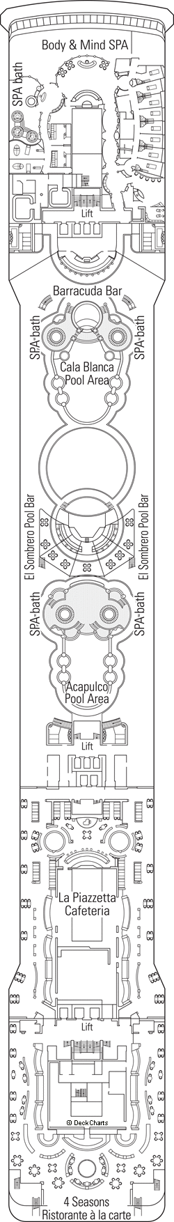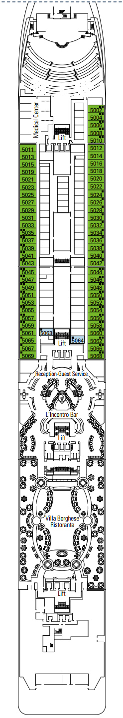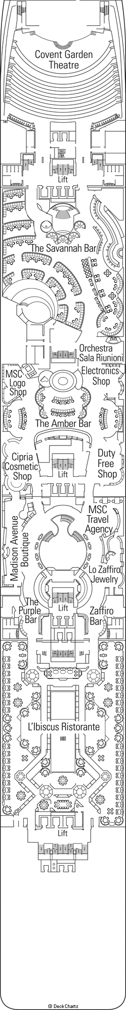 From the moment you step on the MSC Orchestra, you will be stunned by its understated elegance. Five sparkling pools, a Sports Center, a fully equipped gym and a jogging track will keep you active even while at sea. You can also head over to the MSC Aurea Spa to unwind with Turkish baths, saunas, Balinese massages, whirlpool baths and many more treatments for the ultimate pampering. Catch a live show at the Covent Garden Theater or the Savannah Bar, or head over to La Cubana Cigar Room to enjoy uninterrupted cigar bliss. There are several bars for your enjoyment, as well as the Palm Beach Casino and the Card Room. Other amenities include upscale shops, a photo gallery, an Internet Café and a library. Kids will have the cruise of their dreams as well when they head over to the Jungle Adventure playroom or the Teen’s Club, depending on their age. Couples, singles and families of all ages will enjoy their time on the Orchestra.