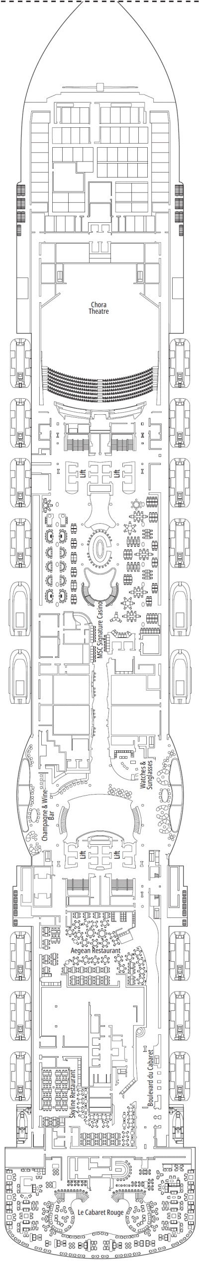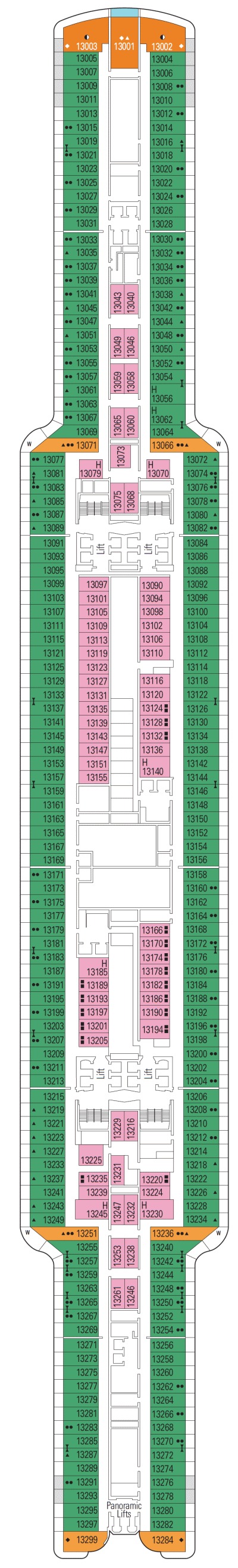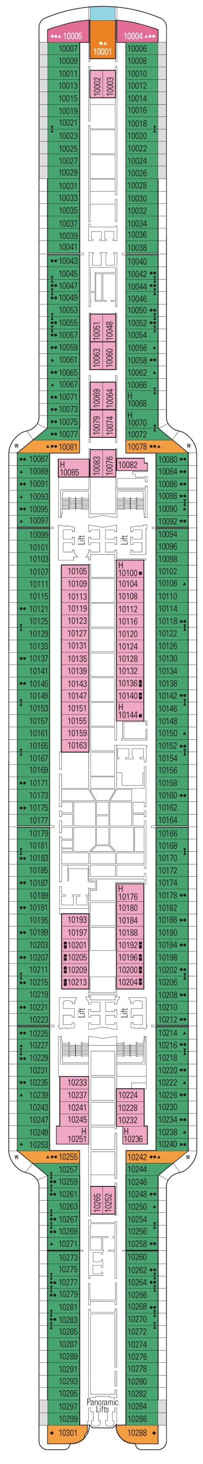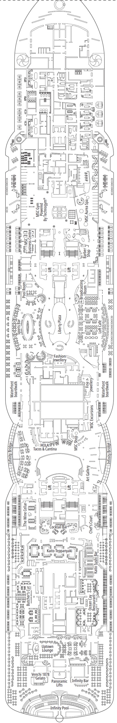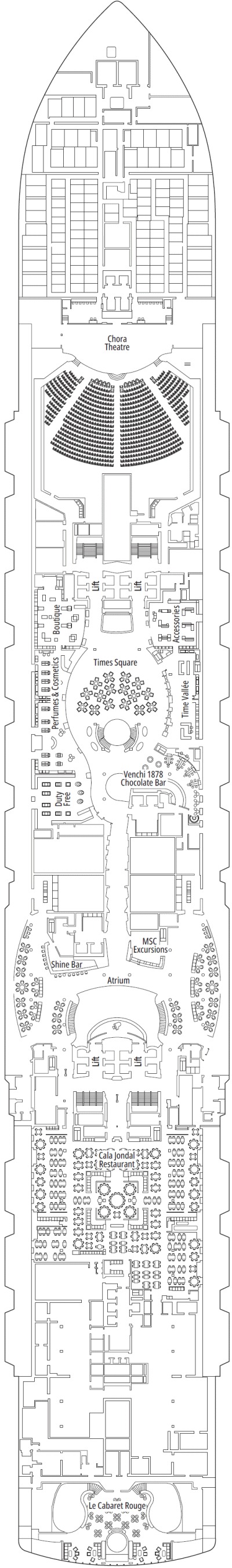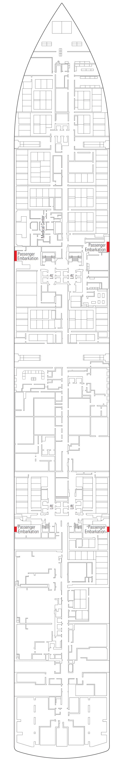 Découvrez les différents ponts du navire, chacun offrant des espaces et des ambiances uniques. Que ce soit pour profiter de la vue, vous détendre, vous divertir ou accéder aux installations principales, les ponts sont conçus pour faciliter votre expérience et vous permettre de vivre pleinement votre croisière.