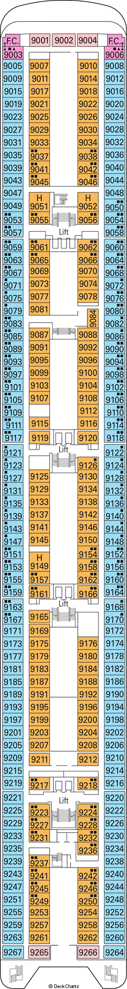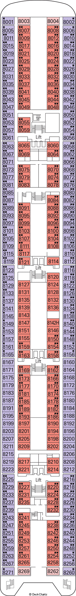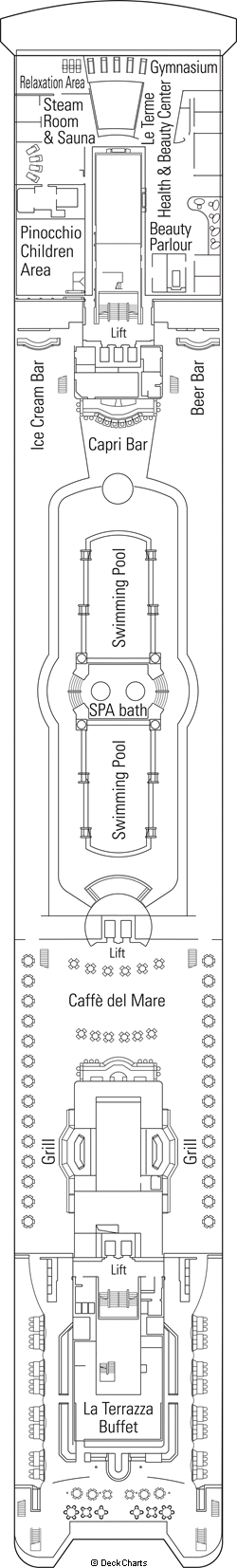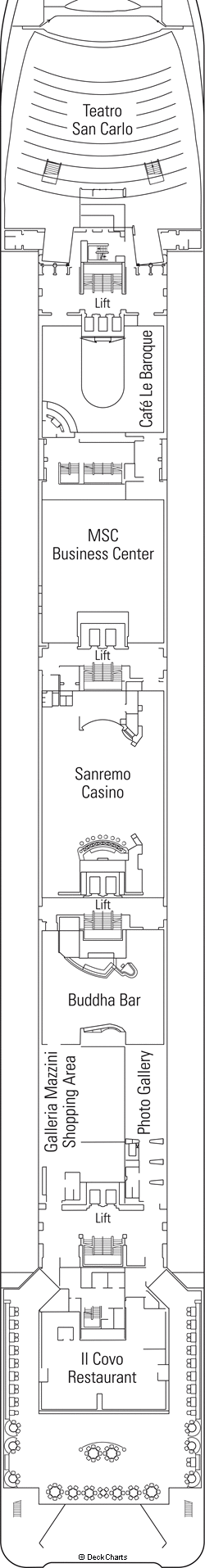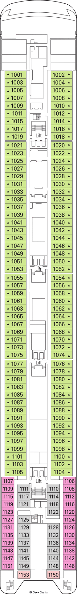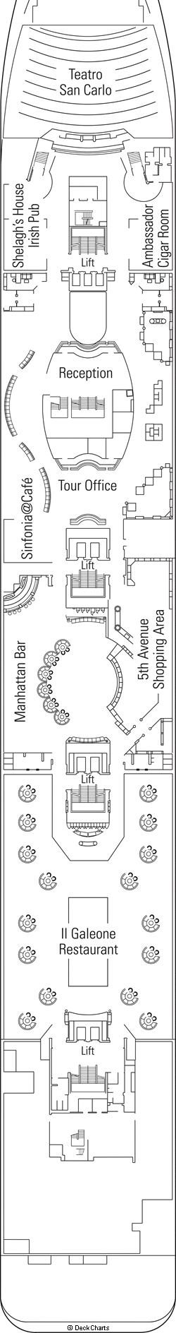 Découvrez les différents ponts du navire, chacun offrant des espaces et des ambiances uniques. Que ce soit pour profiter de la vue, vous détendre, vous divertir ou accéder aux installations principales, les ponts sont conçus pour faciliter votre expérience et vous permettre de vivre pleinement votre croisière.