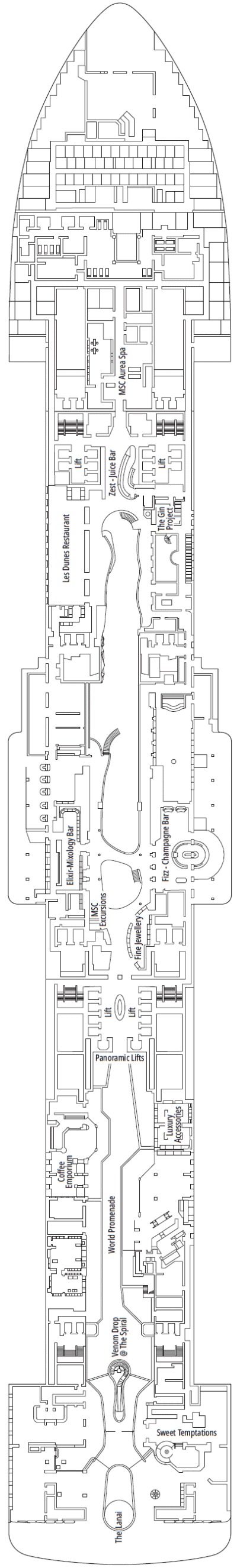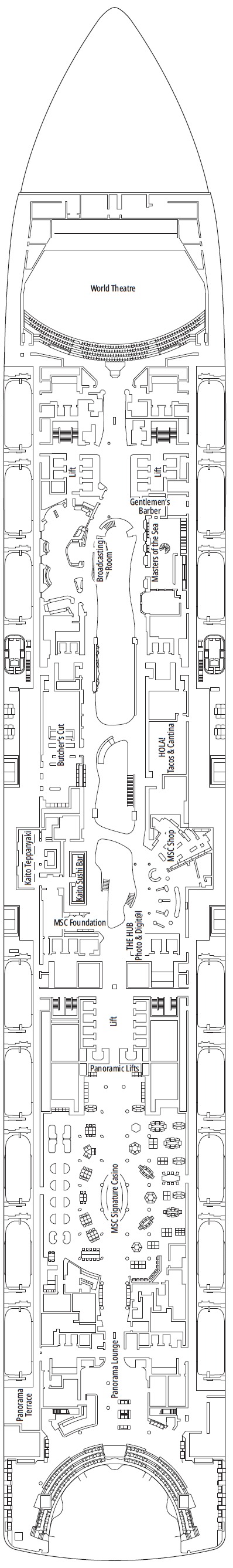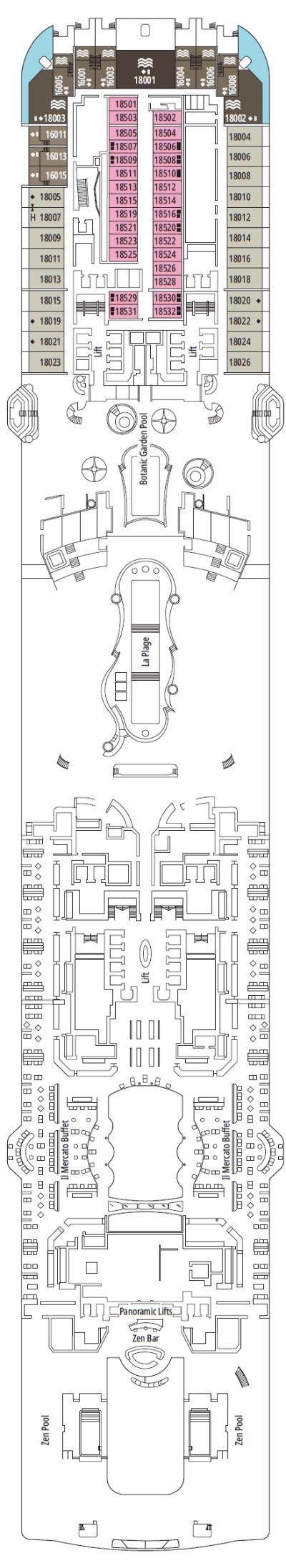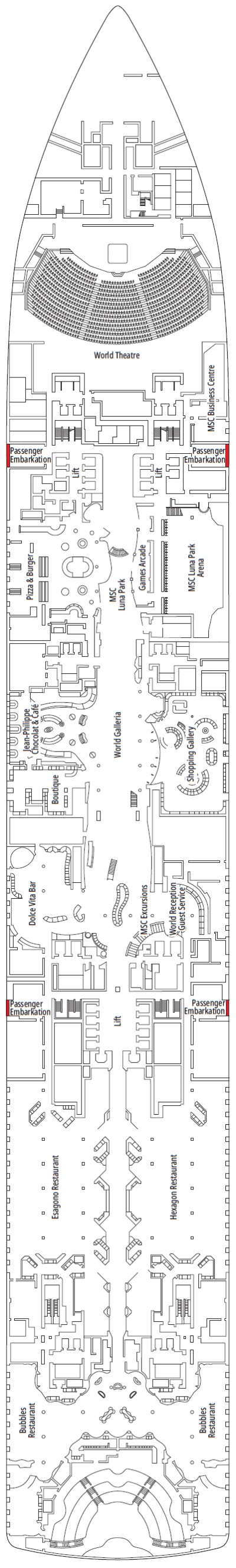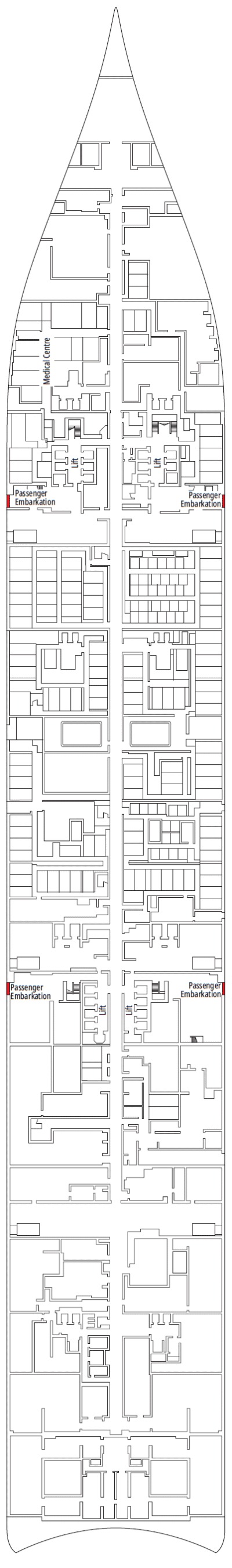 Découvrez les différents ponts du navire, chacun offrant des espaces et des ambiances uniques. Que ce soit pour profiter de la vue, vous détendre, vous divertir ou accéder aux installations principales, les ponts sont conçus pour faciliter votre expérience et vous permettre de vivre pleinement votre croisière.