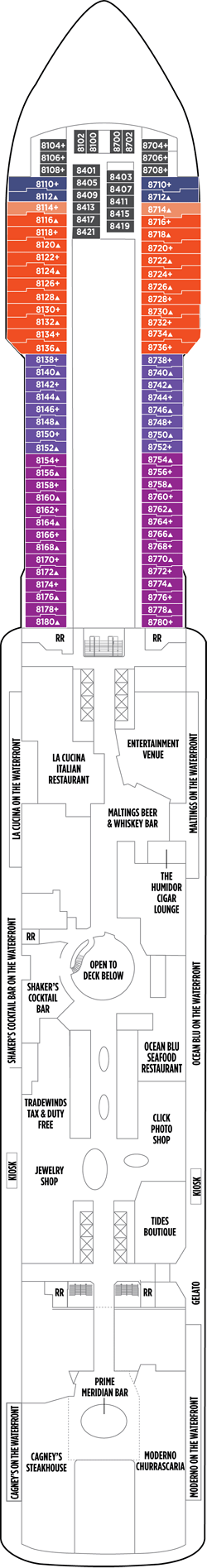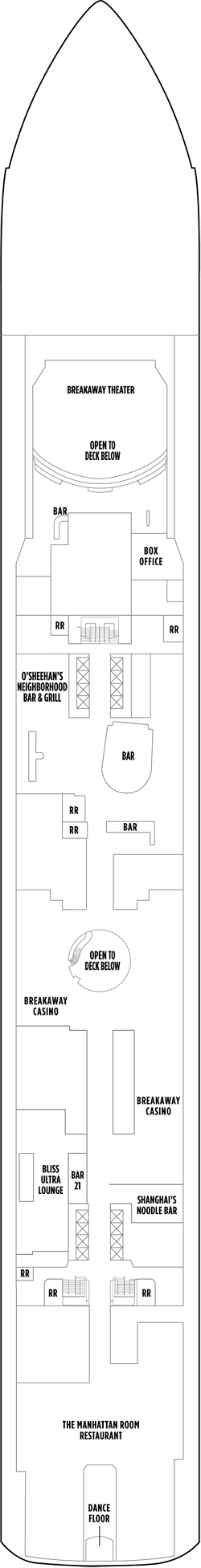 Breakaway vous permet de vous connecter à la mer le long de The Waterfront, une longue promenade en bord de mer bordée de restaurants, de bars et de vues magnifiques. Sur le pont supérieur, il y a cinq toboggans aquatiques, deux piscines et quatre jacuzzis. Les enfants ont même leur propre parc aquatique. Le complexe sportif est composé de trois étages de divertissements à sensations fortes, y compris le plus grand parcours de cordes en mer. Les adultes apprécieront le casino et le Spice H2O réservé aux adultes. Les adolescents ont leur propre lieu de rencontre appelé Entourage, et les plus jeunes peuvent se rendre à la Splash Academy, l'un des plus grands espaces pour enfants de la ligne Norwegian. La grande variété de bars et de restaurants ravira également tous les palais. L'un des favoris des passagers est le Syd Norman's Pour House, qui est conçu comme un club de rock de Los Angeles. Dégustez des boissons à thème, interrogez un barman expérimenté et faites du rock and roll toute la nuit. Les autres attractions comprennent des salons, des spectacles, un centre de remise en forme et un spa. Ceux qui réservent des cabines de la catégorie The Haven pourront profiter de leurs propres espaces et équipements privés. Tout le monde trouvera son bonheur sur le Norwegian Breakaway.
