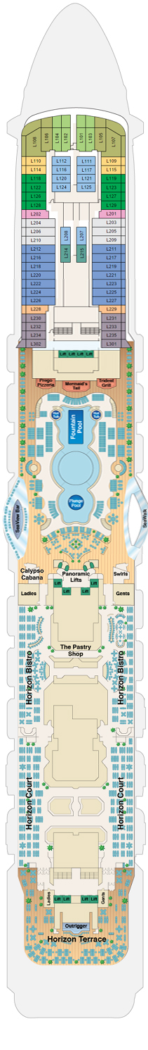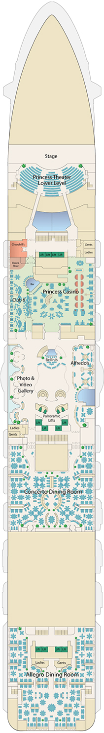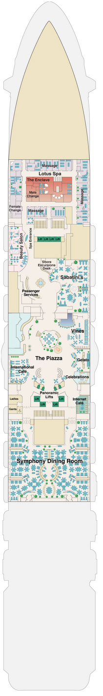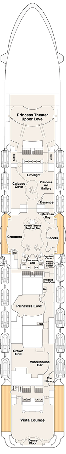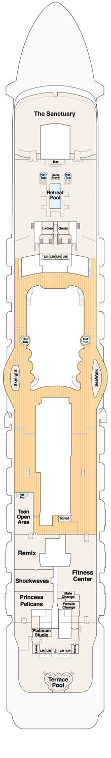 Le Regal Princess, navire jumeau du Royal Princess, impressionnera à coup sûr ses 3 600 passagers avec des innovations passionnantes et des caractéristiques distinctives. L'une des caractéristiques les plus uniques du navire est le SeaWalk, une passerelle en verre qui s'étend sur 28 pieds au-delà du bord du navire. Une grande variété d'options de restauration inclusives signifie que le Princess peut satisfaire tous les goûts avec ses aliments frais. Il existe également plusieurs restaurants de spécialités pour ceux qui souhaitent un repas plus exclusif. Vous pouvez choisir de dîner à tout moment ou d'opter pour un dîner plus traditionnel avec la même heure, les mêmes serveurs et la même compagnie tous les soirs. Les adultes peuvent profiter de leur propre moment de tranquillité au Sanctuary pendant que les enfants participent seuls à des activités enrichissantes selon leur âge. Le Lotus Spa offre des soins bien mérités. L'Enclave est la plus grande suite thermale jamais construite par le Princess et dispose d'une piscine d'hydrothérapie avec une douche à effet pluie en cascade et des jets d'air thérapeutiques. Lorsque vous avez fini de vous détendre, rendez-vous au Club 6, une discothèque chic et élégante avec une atmosphère intime et un bar à service complet. D'autres options de divertissement sont proposées, comme le shopping, les ventes aux enchères, le cybercafé, une bibliothèque, des films sous les étoiles, le spectacle de fantaisie d'aquarelle de la princesse, des productions musicales originales et des spectacles en direct.