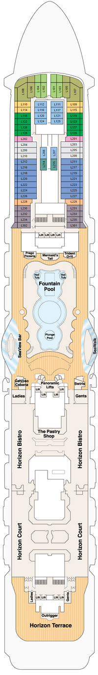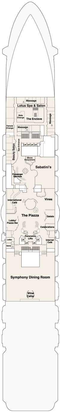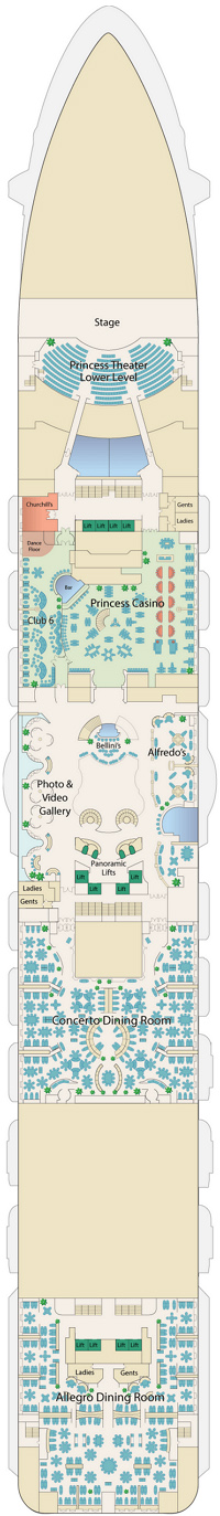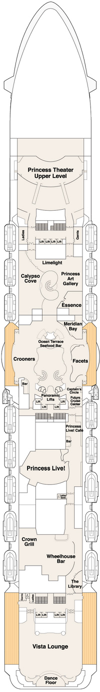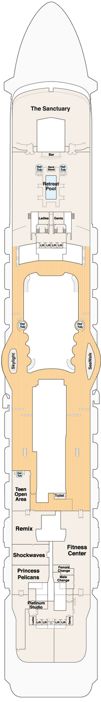 Le Royal Princess offre à ses 3 500 passagers des équipements et des divertissements passionnants. La plus grande piscine jamais construite sur le pont supérieur du Princess propose un spectacle d'eau et de lumière en soirée, et une piscine du pont supérieur – exclusivement réservée aux adultes – comprend des cabanes privées luxueuses où vous pourrez profiter de la brise marine en toute tranquillité. Le SeaWalk est le premier du genre en mer, une passerelle en verre de 18 mètres de long au-dessus de l'océan. Le soir, invitez tout le monde à voir le spectacle de l'eau danser au rythme de la musique sur le pont tandis que des fontaines jaillissent à 10 mètres de haut, chorégraphiées au rythme de la musique. Les mélomanes apprécieront également le Club 6, les productions musicales originales, The Voice of the Ocean et de nombreux artistes invités talentueux. Visitez les boutiques ou les ventes aux enchères d'œuvres d'art pour ramener à la maison un merveilleux souvenir qui vous rappellera votre croisière. Vous pouvez également rester en contact avec les gens de chez vous dans le cybercafé et la bibliothèque. Détendez-vous au spa pendant que les enfants profitent de leurs propres espaces. Le Lotus Spa propose des soins exclusifs, un centre de remise en forme entièrement équipé, un bain turc, un hammam, une chambre sèche et une piscine d'hydrothérapie spectaculaire avec une douche à effet pluie. Quels que soient vos goûts, Princess offre une atmosphère accueillante et des offres innovantes qui font du navire une destination aussi importante que n'importe quel port.