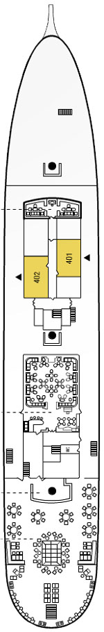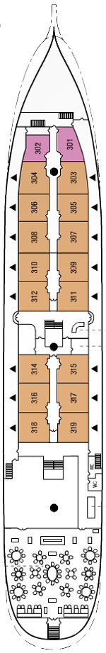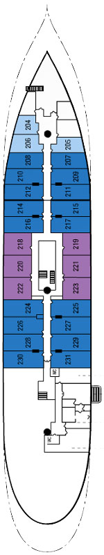 Découvrez les différents ponts du navire, chacun offrant des espaces et des ambiances uniques. Que ce soit pour profiter de la vue, vous détendre, vous divertir ou accéder aux installations principales, les ponts sont conçus pour faciliter votre expérience et vous permettre de vivre pleinement votre croisière.