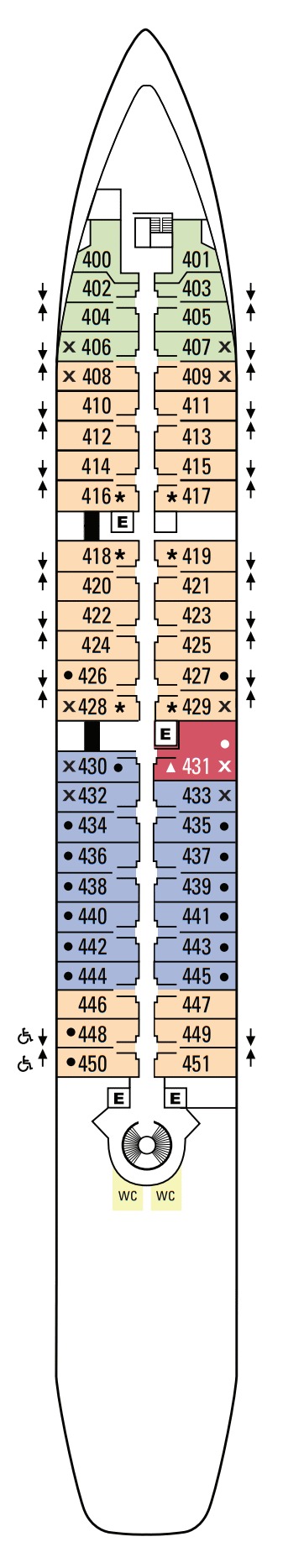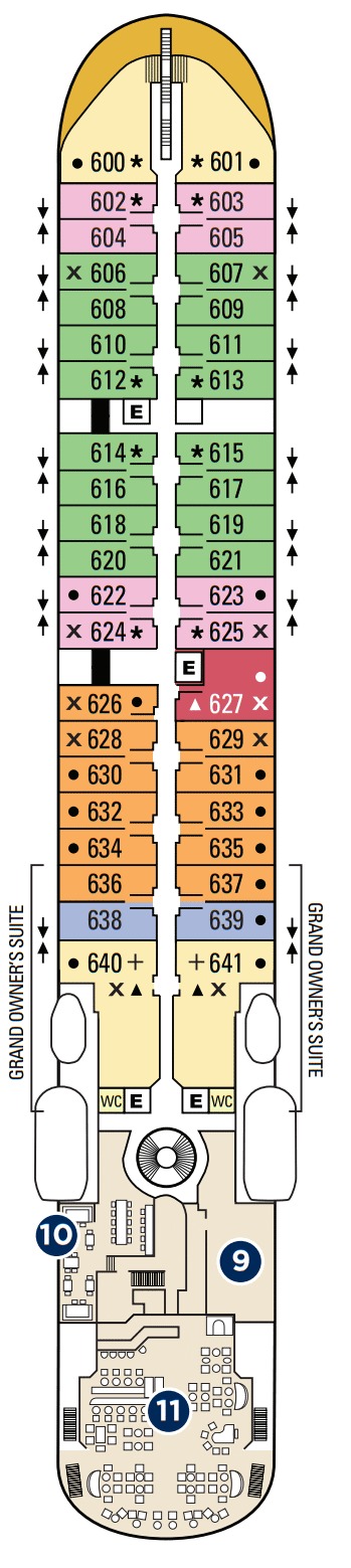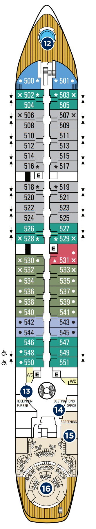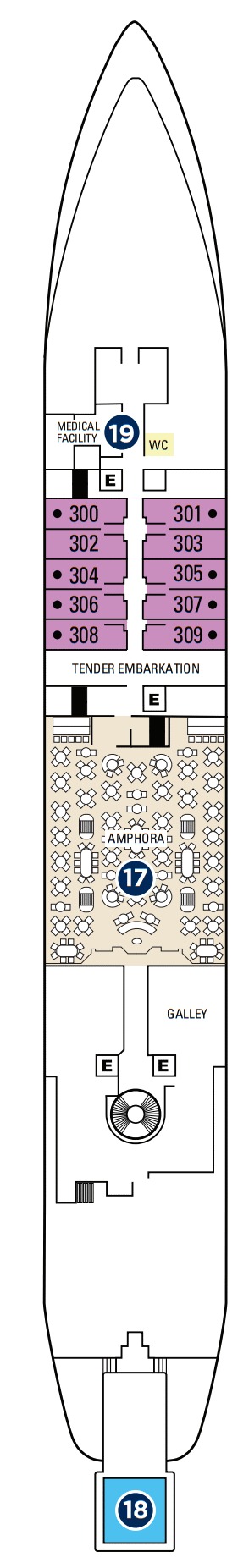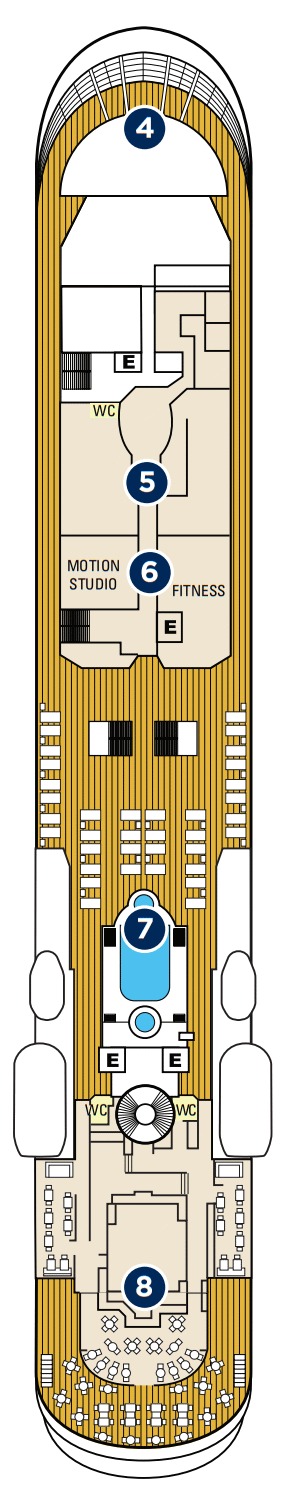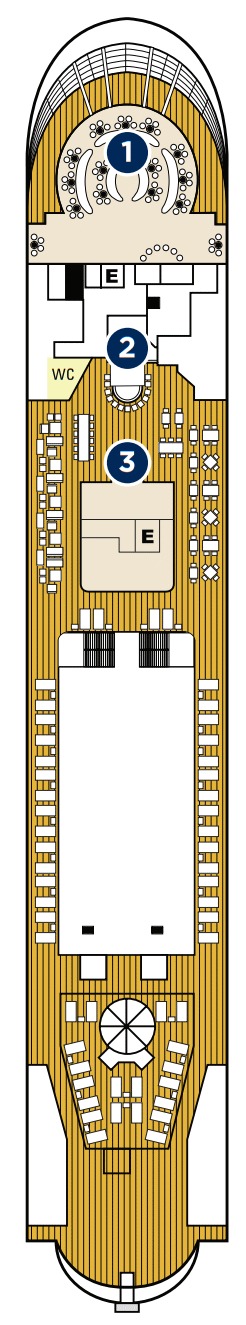 Découvrez les différents ponts du navire, chacun offrant des espaces et des ambiances uniques. Que ce soit pour profiter de la vue, vous détendre, vous divertir ou accéder aux installations principales, les ponts sont conçus pour faciliter votre expérience et vous permettre de vivre pleinement votre croisière.