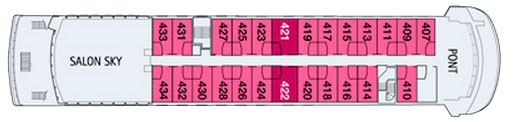 Découvrez les différents ponts du navire, chacun offrant des espaces et des ambiances uniques. Que ce soit pour profiter de la vue, vous détendre, vous divertir ou accéder aux installations principales, les ponts sont conçus pour faciliter votre expérience et vous permettre de vivre pleinement votre croisière.