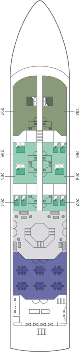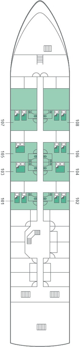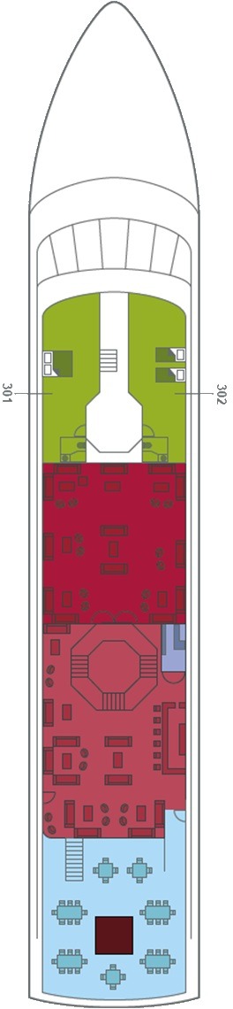 Découvrez les différents ponts du navire, chacun offrant des espaces et des ambiances uniques. Que ce soit pour profiter de la vue, vous détendre, vous divertir ou accéder aux installations principales, les ponts sont conçus pour faciliter votre expérience et vous permettre de vivre pleinement votre croisière.
