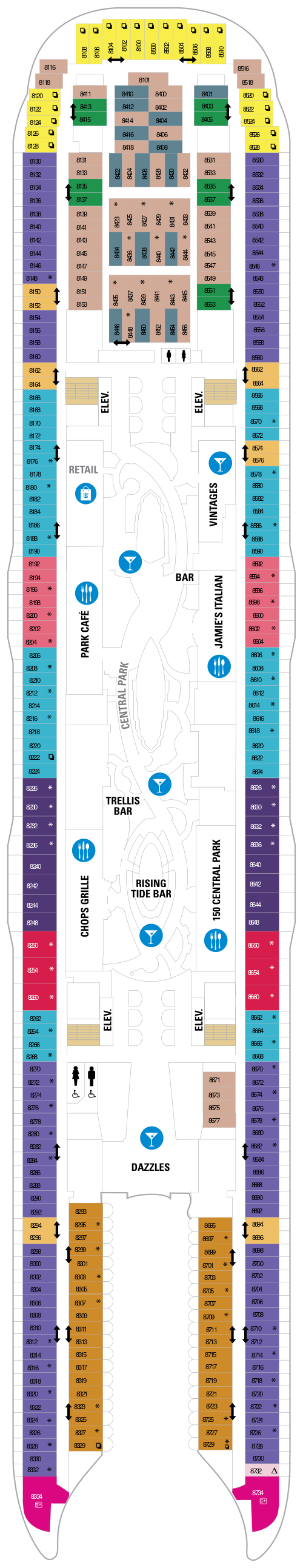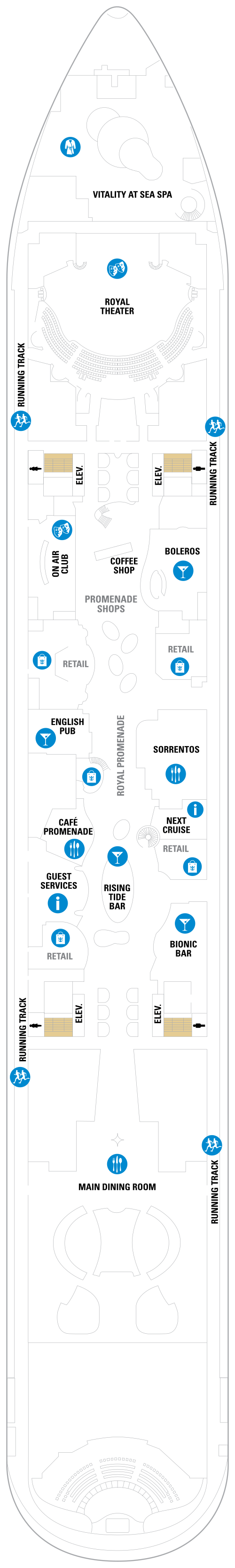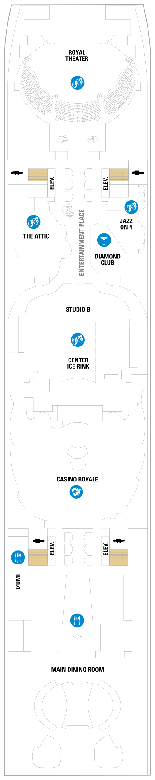 Quatrième navire à rejoindre la classe Oasis, le Symphony of the Seas propose une grande variété d'activités, d'équipements et de divertissements. Partez à la conquête du mur d'escalade, attrapez une vague sur le FlowRider, un simulateur de surf de 12 mètres de long, ou descendez une tyrolienne qui s'élève sur 9 ponts dans les airs au-dessus du navire. Les passagers à la recherche d'un moment plus détendu peuvent se rendre au spa Vitality à service complet, suivre un cours de yoga au centre de remise en forme ou profiter du soleil à la piscine de la plage. Certains des logements à bord disposent d'un balcon avec vue sur Central Park ou Boardwalk, qui offre aux clients une sensation de confort dans le quartier et des sensations fortes juste derrière la porte. Central Park offre une atmosphère new-yorkaise pour une expérience ultime en ville, tandis que le Boardwalk offre des heures de divertissement, des manèges aux friandises et plus encore. Après une journée au port, détendez-vous avec un verre au Rising Tide Bar sur la Royal Promenade avant d'aller voir un spectacle au Royal Theater ou à l'Aqua Theater. Une visite au Bionic Bar offrira aux clients l'expérience de barmans robots servant leurs boissons préférées. Il existe également une variété de restaurants spécialisés, tels que le Johnny Rockets, un restaurant de style années 50, Giovanni’s Table, Izumi et Jamie’s Italian. Le Symphony of the Seas propose également le programme gratuit Adventure Ocean® Youth, le programme Royal Babies® et Royal Tots®, des espaces salon et discothèque pour adolescents, ainsi que le parc aquatique pour enfants Splashaway Bay.