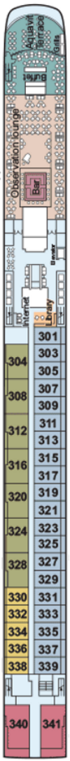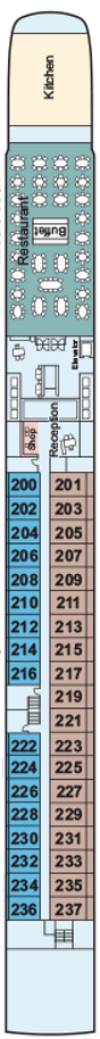 Découvrez les différents ponts du navire, chacun offrant des espaces et des ambiances uniques. Que ce soit pour profiter de la vue, vous détendre, vous divertir ou accéder aux installations principales, les ponts sont conçus pour faciliter votre expérience et vous permettre de vivre pleinement votre croisière.