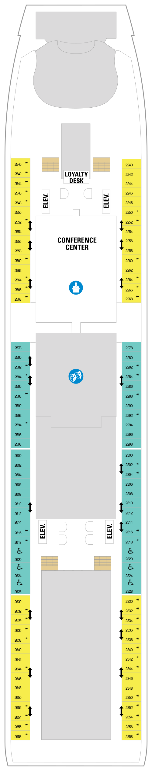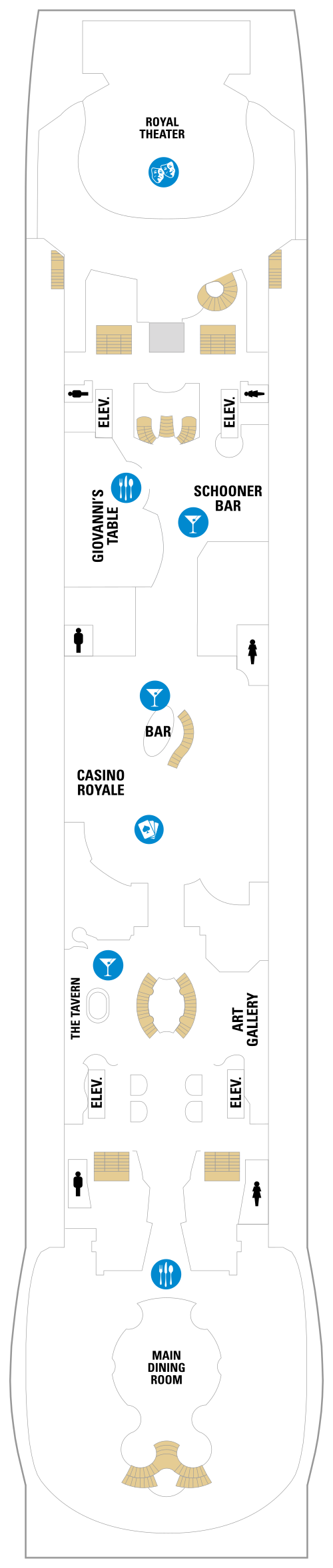 • Casino Royale : Ce casino, l'un des plus vastes en mer, satisfait toutes les envies de jeu en proposant aux passagers blackjack, roulette, craps, Stud Poker des Caraïbes, jeux de vidéo-poker et des machines à sous. Le casino accepte : Espèces, Chèques de voyage, Chèques personnel (2 par passager et par croisière, pour un montant maximal de $450), toutes types de cartes de crédit. Les comptes de bord SeaPass peuvent être utilisés avec une garantie par carte de crédit pour un montant maximal de $2000 par jour et par passager et de $100 par jour pour les comptes en espèces.