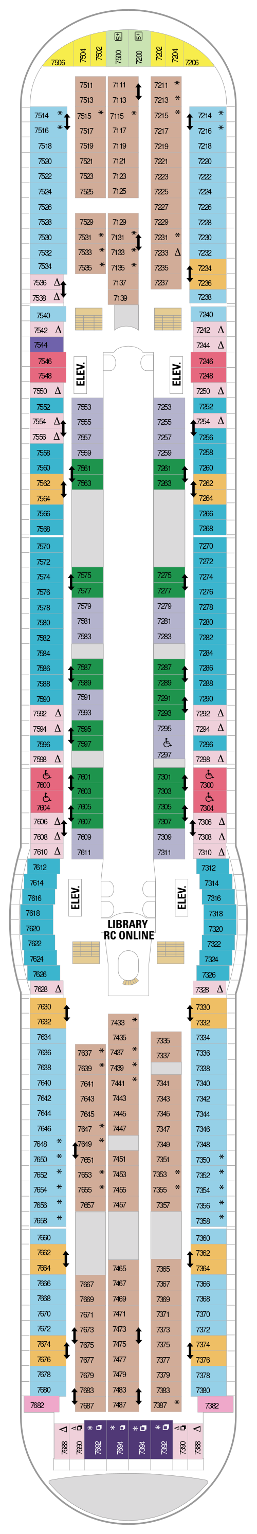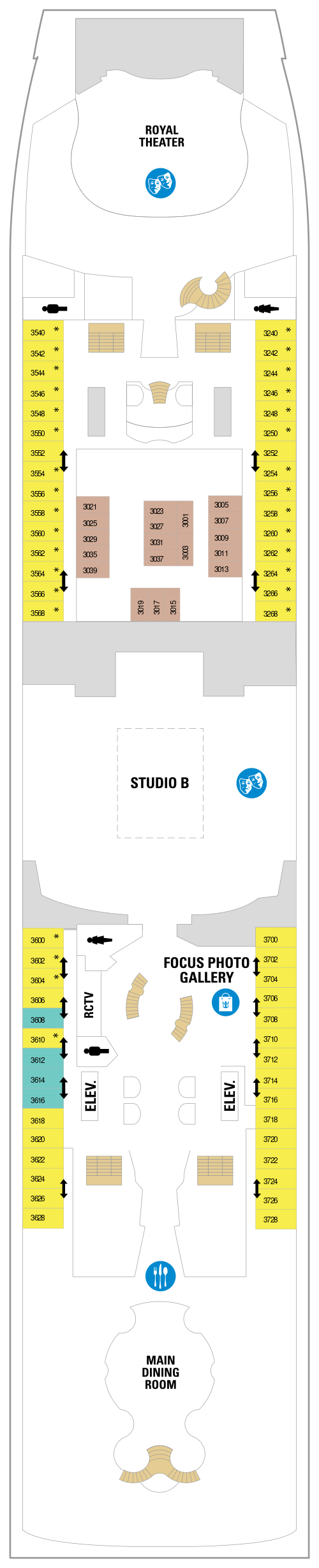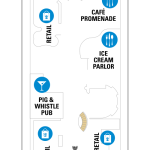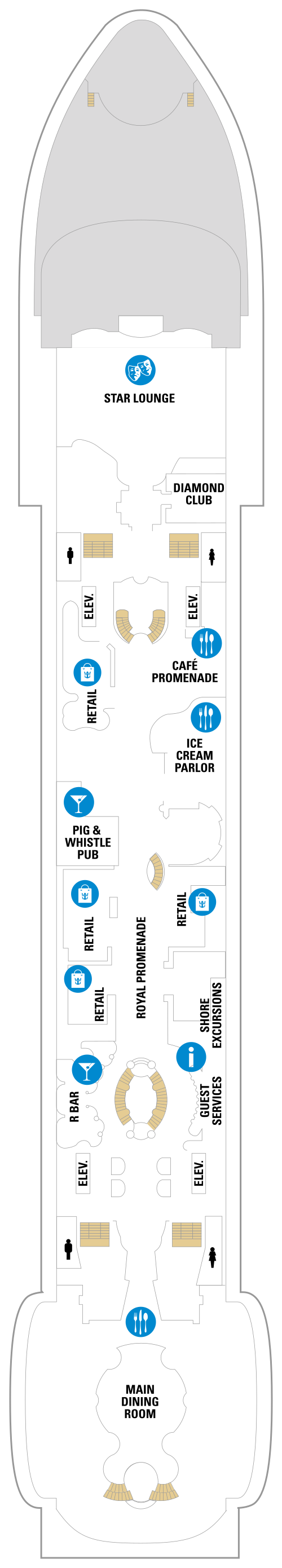 • La Royal Promenade : Première galerie commerçante horizontale à bord d'un navire, haute de quatre ponts et plus longue que deux terrains de football : la Royal Promenade est le coeur des navires de la Classe Voyager et offre la possibilité de dîner 24h/24, ainsi qu'une sélection de bars, des spectacles et tout un monde de boutiques à découvrir