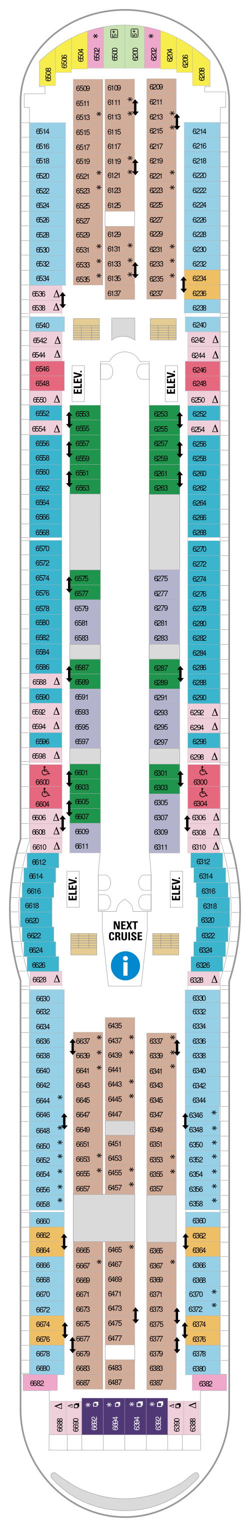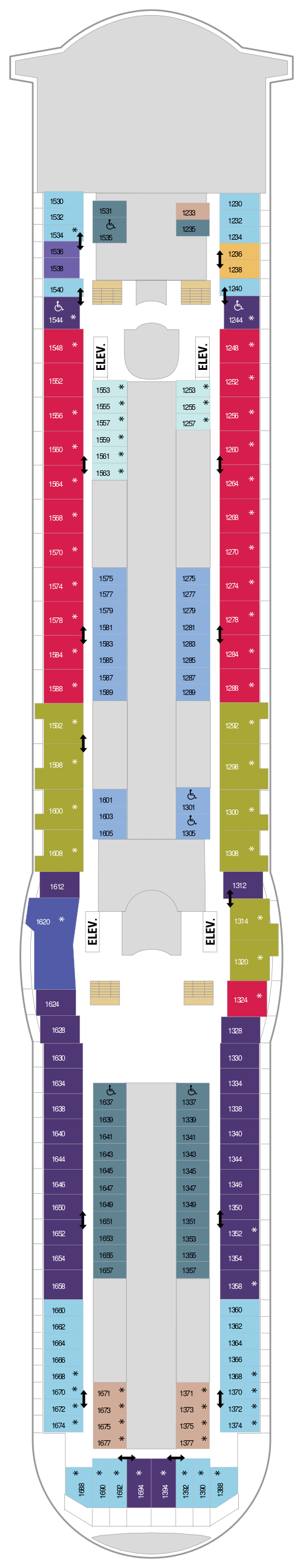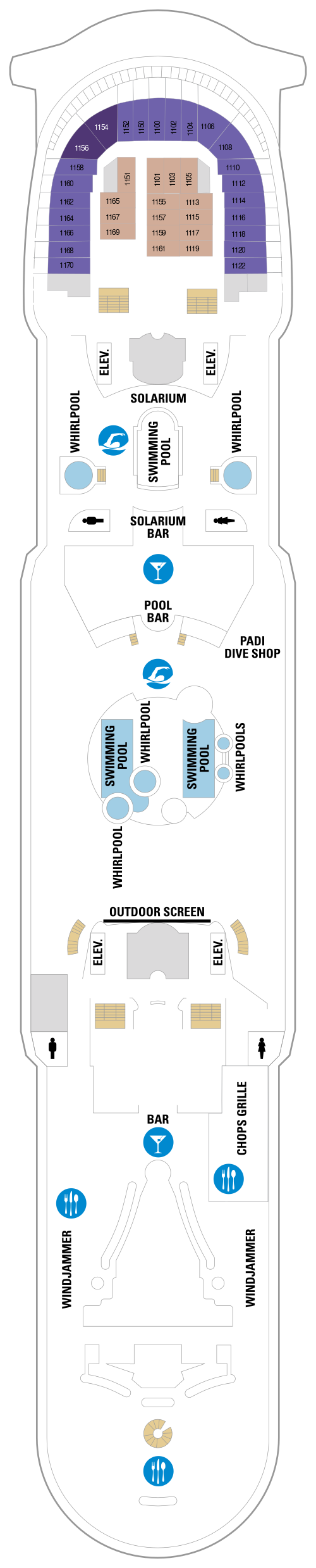 Découvrez les différents ponts du navire, chacun offrant des espaces et des ambiances uniques. Que ce soit pour profiter de la vue, vous détendre, vous divertir ou accéder aux installations principales, les ponts sont conçus pour faciliter votre expérience et vous permettre de vivre pleinement votre croisière.