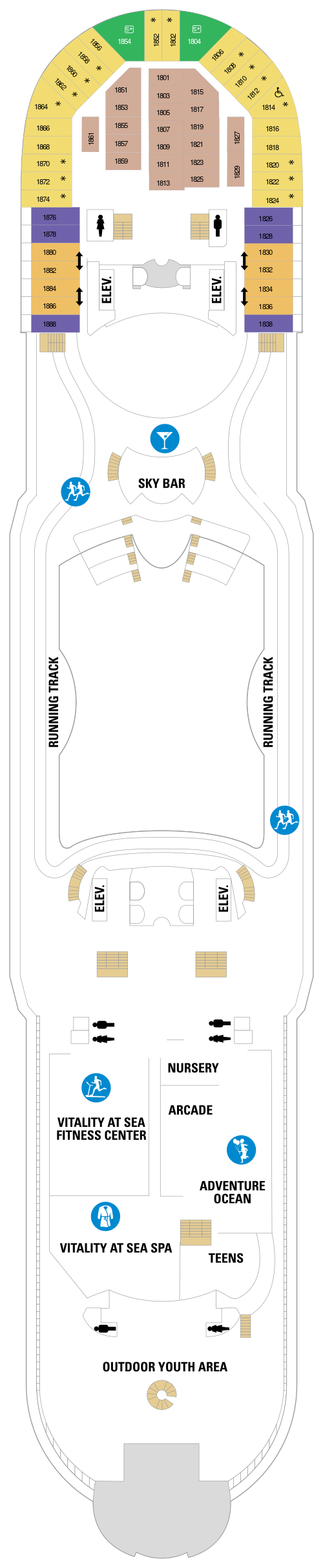 • Adventure Ocean : Un espace de jeu pour enfants, avec sa pataugeoire et un espace réservé aux parents. Possède également un restaurant de style "dîner " pour les familles, la discothèque pour les ados et une arcade de jeux vidéo.